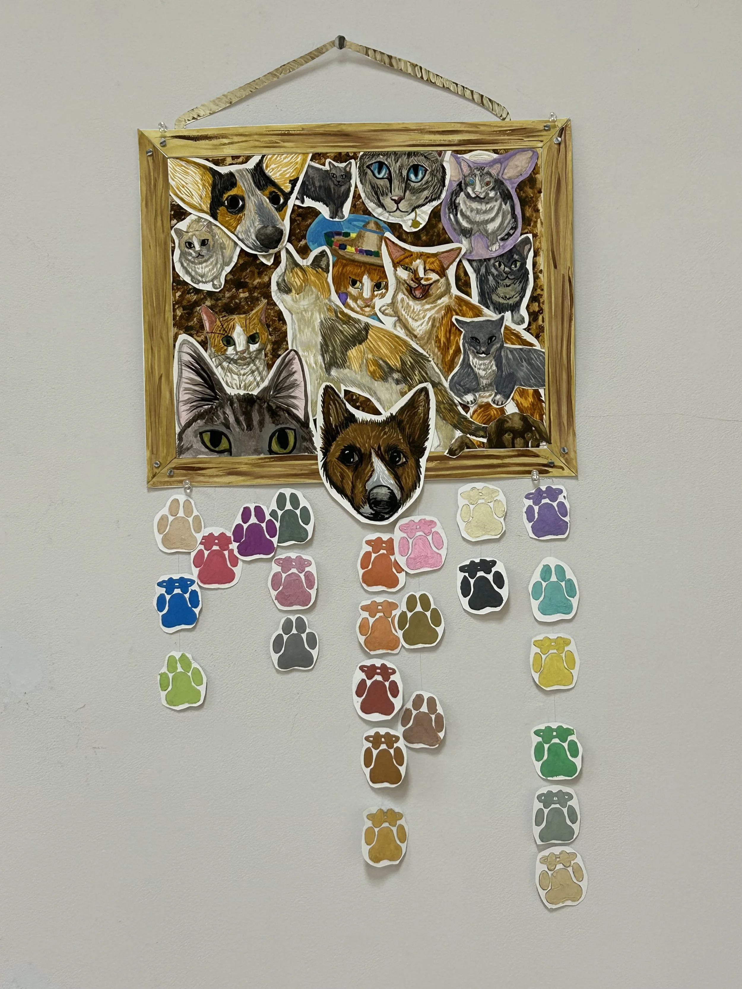 This piece was made traditionally with watercolor paint. It was made to look like a pin board with photo’s on it, and the paws at bottom are for the pet’s who I did not have room for or who have passed away. I made it to help me and my family help with losing our pets.